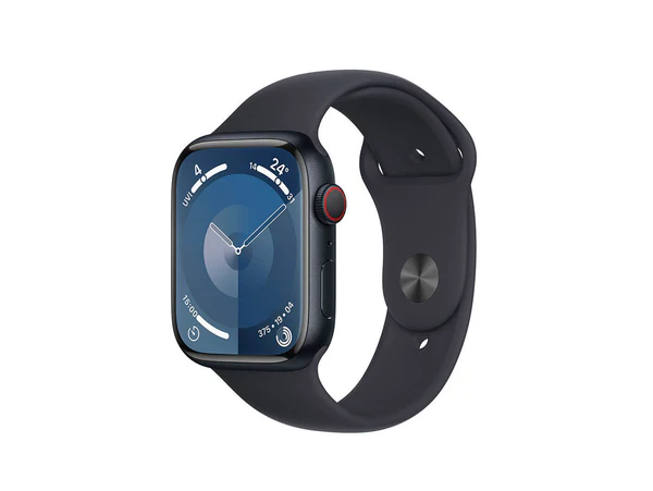 أبل ساعة سيريز 9 مزودة بنظام تحديد المواقع + هيكل من الألومنيوم ميدنايت مقاس 45 ملم مزود بشبكة خلوية وحزام رياضي ميدنايت - ميديم/لارج